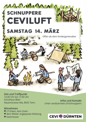 Unser Schnupperprogramm richtet sich an alle Familien mit Kindern ab dem 1. Kindergarten. Es ist ein kostenloses und unverbindliches Angebot des Cevi Dürnten und für interessierte Kinder und Eltern die ideale Gelegenheit, uns näher kennenzulernen. Eine spätere Teilnahme an unseren Angeboten ist aber keine Voraussetzung. Unserer Erfahrung nach kommen die meisten neuen Kinder zu uns, weil sie entweder ein «Gspänli» begleiten oder weil sie von Eltern geschickt werden, die Gutes über den Cevi gehört haben. Genau darauf sind wir angewiesen! Wenn Sie also den Cevi auch «mega läss» finden, machen Sie doch in Ihrem Bekanntenkreis oder der Nachbarschaft ein bisschen Werbung für uns.